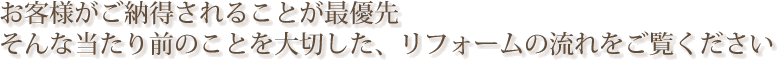 ご要望をお聞きした上で、お打合せの日程を決めさせていただきます。物件を拝見させていただき、現地の調査をおこないます。できましたら図面もご用意いただきまして現状のご不満な点やリフォーム内容のご希望などお聞かせ下さい。